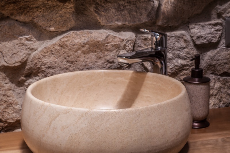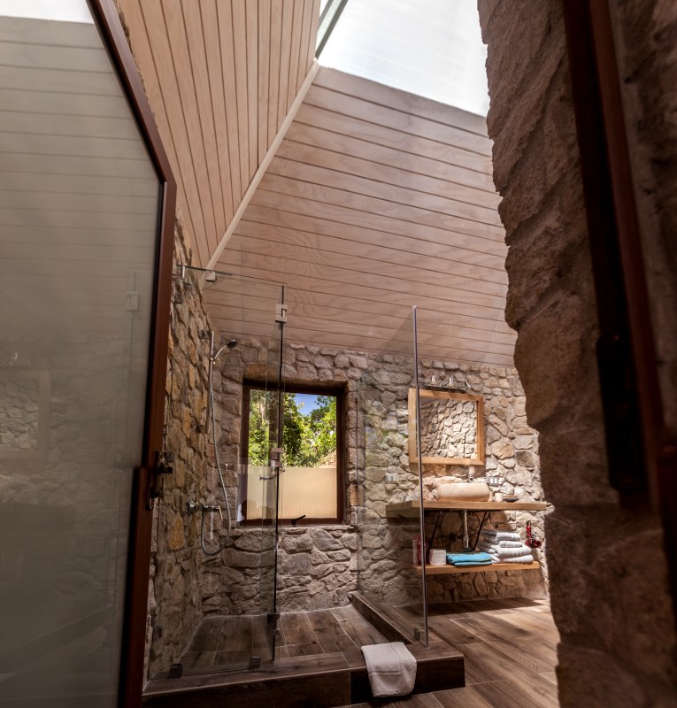 The walls are made of stone with quartz and the roof has four transparent pyramides.